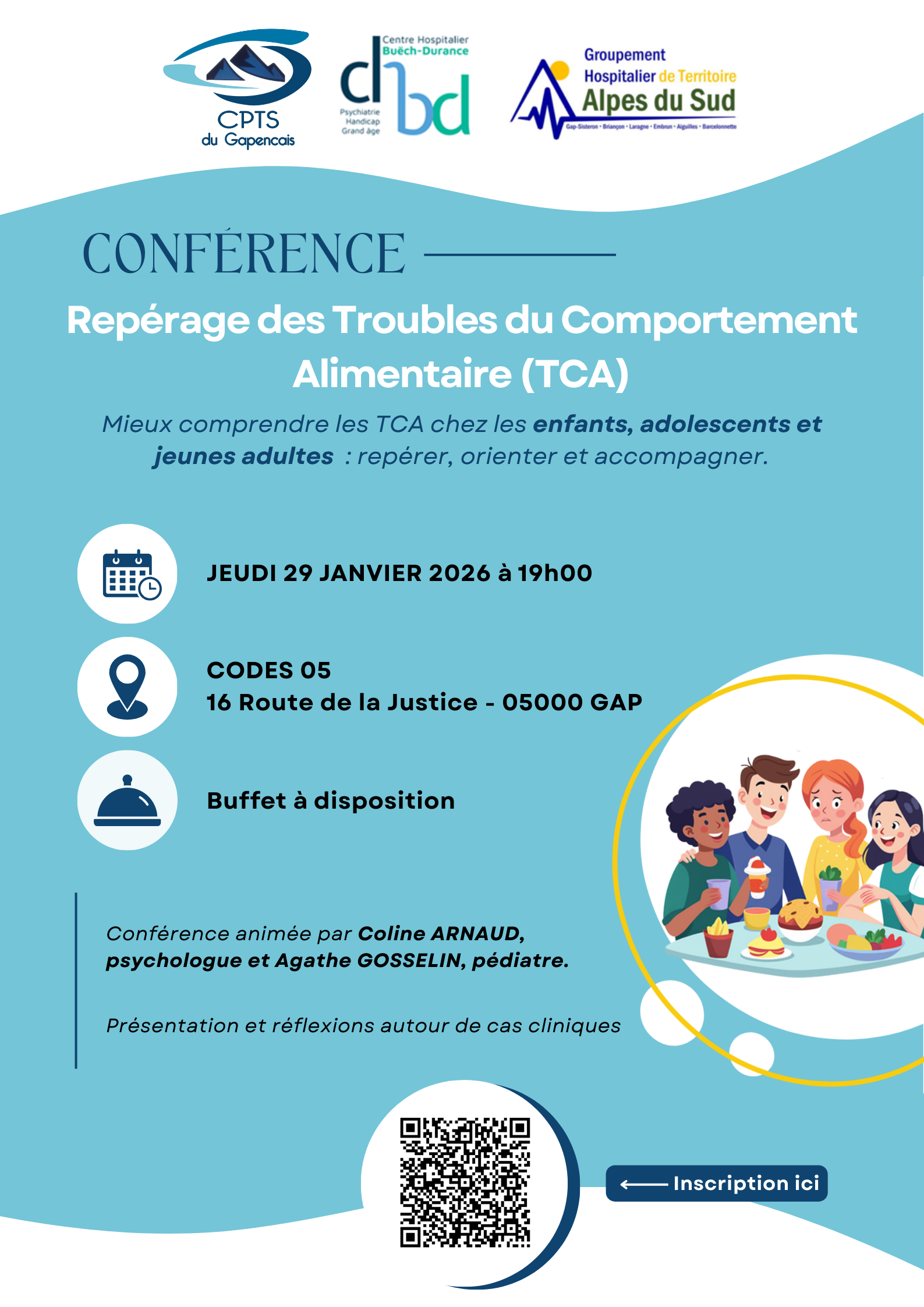 La CPTS du Gapençais, en partenariat avec le Centre Hospitalier Buëch-Durance et le Groupement Hospitalier de Territoire Alpes du Sud, organise une conférence dédiée aux Troubles du Comportement Alimentaire (TCA).